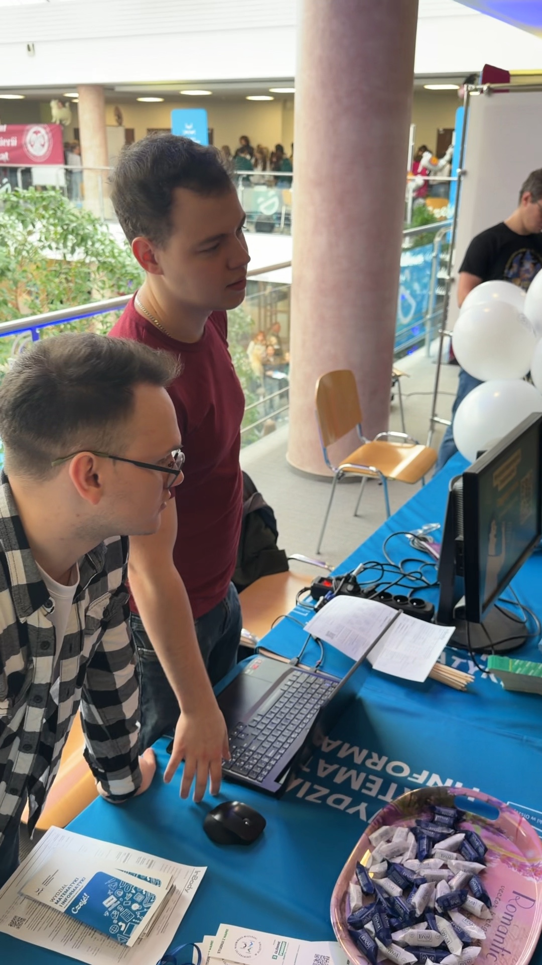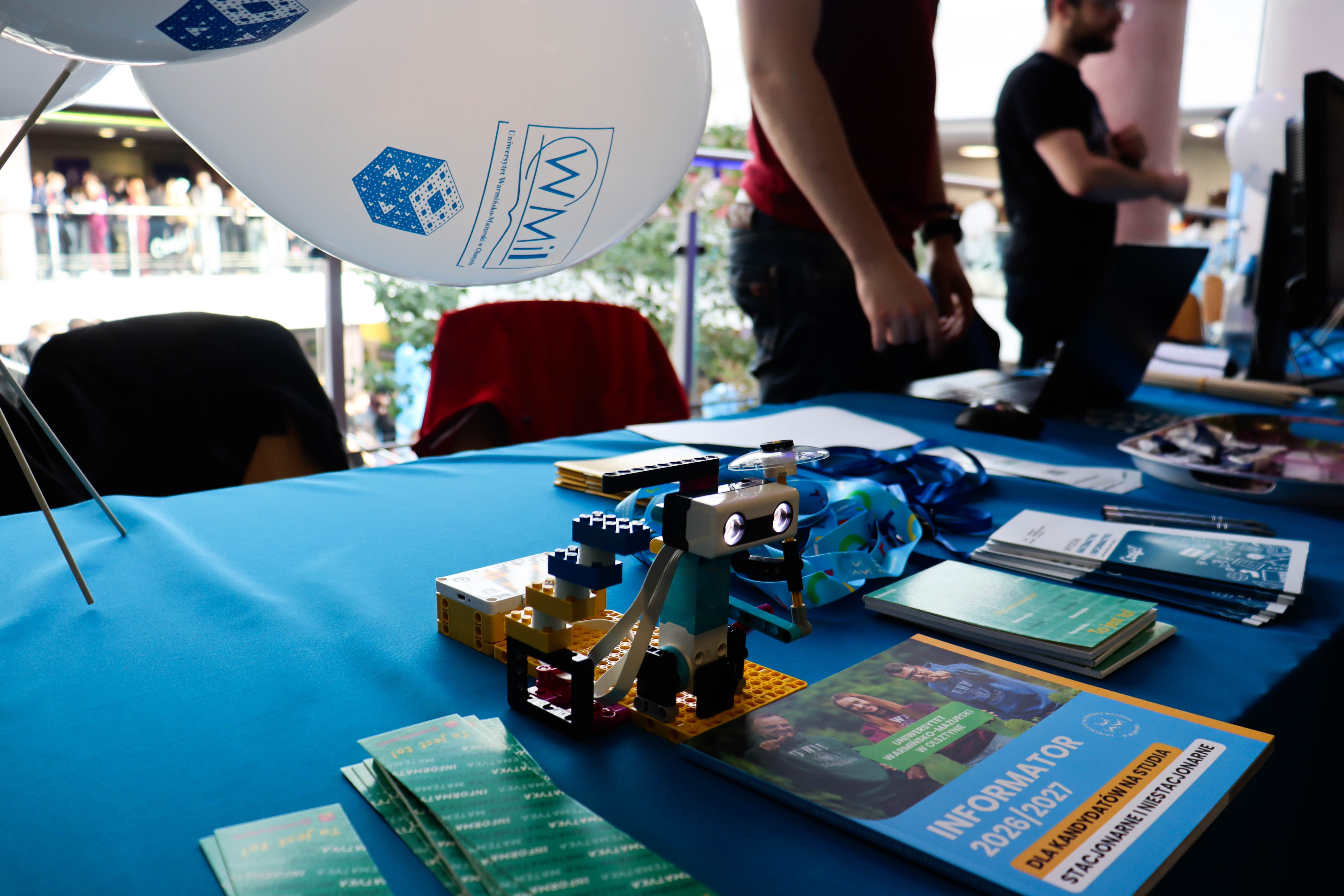 Przy stoisku Wydziału Matematyki i Informatyki zgromadziło się wiele osób, które chciały poznać ofertę studiów na naszym wydziale. Studenci z Rady Wydziałowej Samorządu Studenckiego WMiI z zaangażowaniem odpowiadali na każde zadane pytanie. Na naszym stanowisku zaprezentowaliśmy robota Lego Spike oraz udostępniliśmy mini gry komputerowe.
